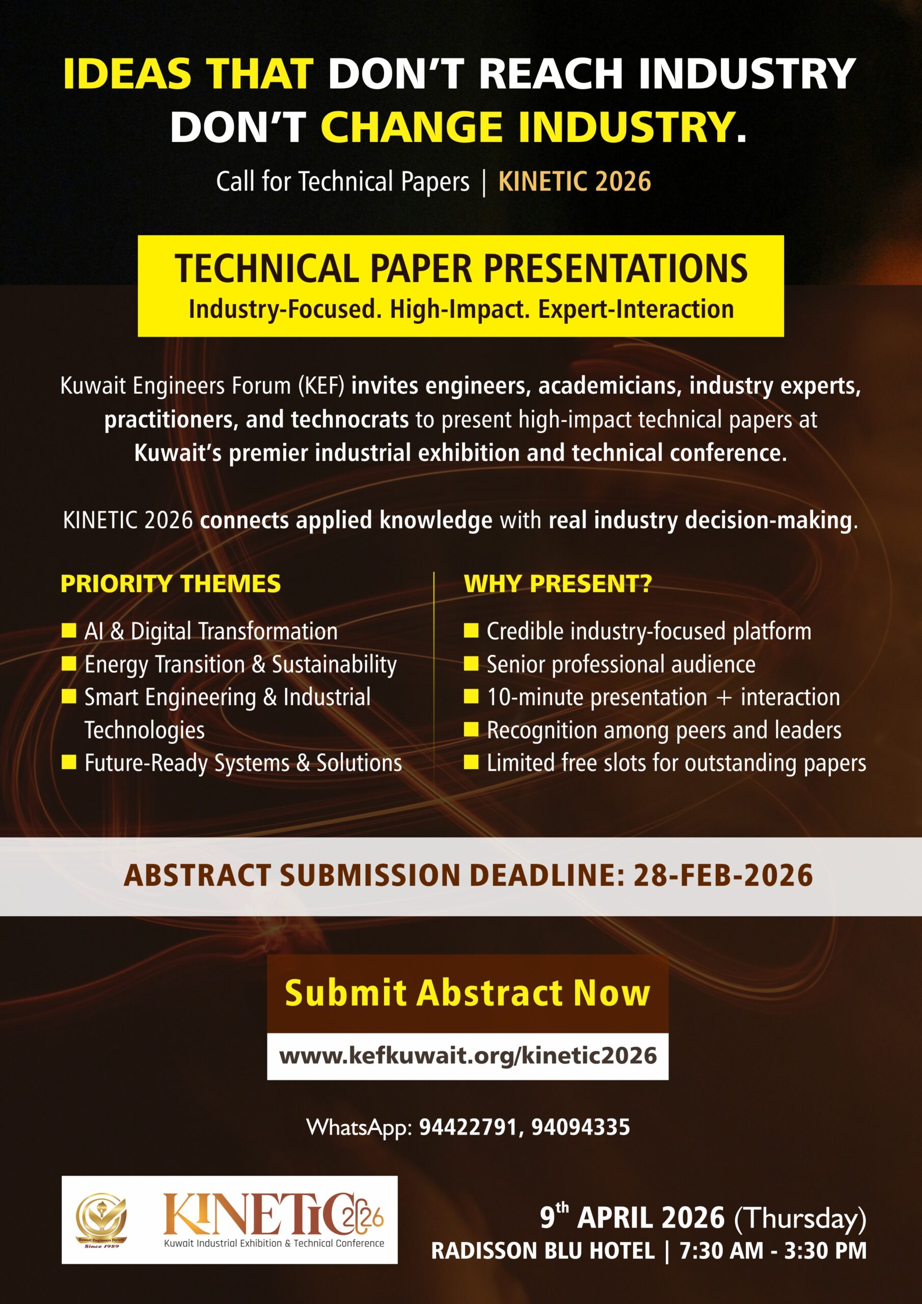 Log on to www.kefkuwait.org/kinetic2026 to submit your interest and abstract today. Last date for submission is 15-March-2026.